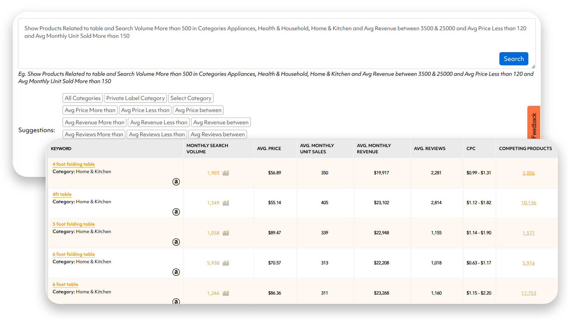 E.g. Ask “For example, Show Products Related to table top in Categories Appliances and Health & Household and Avg Revenue between 4500 & 25000” and it will list out the same for you.